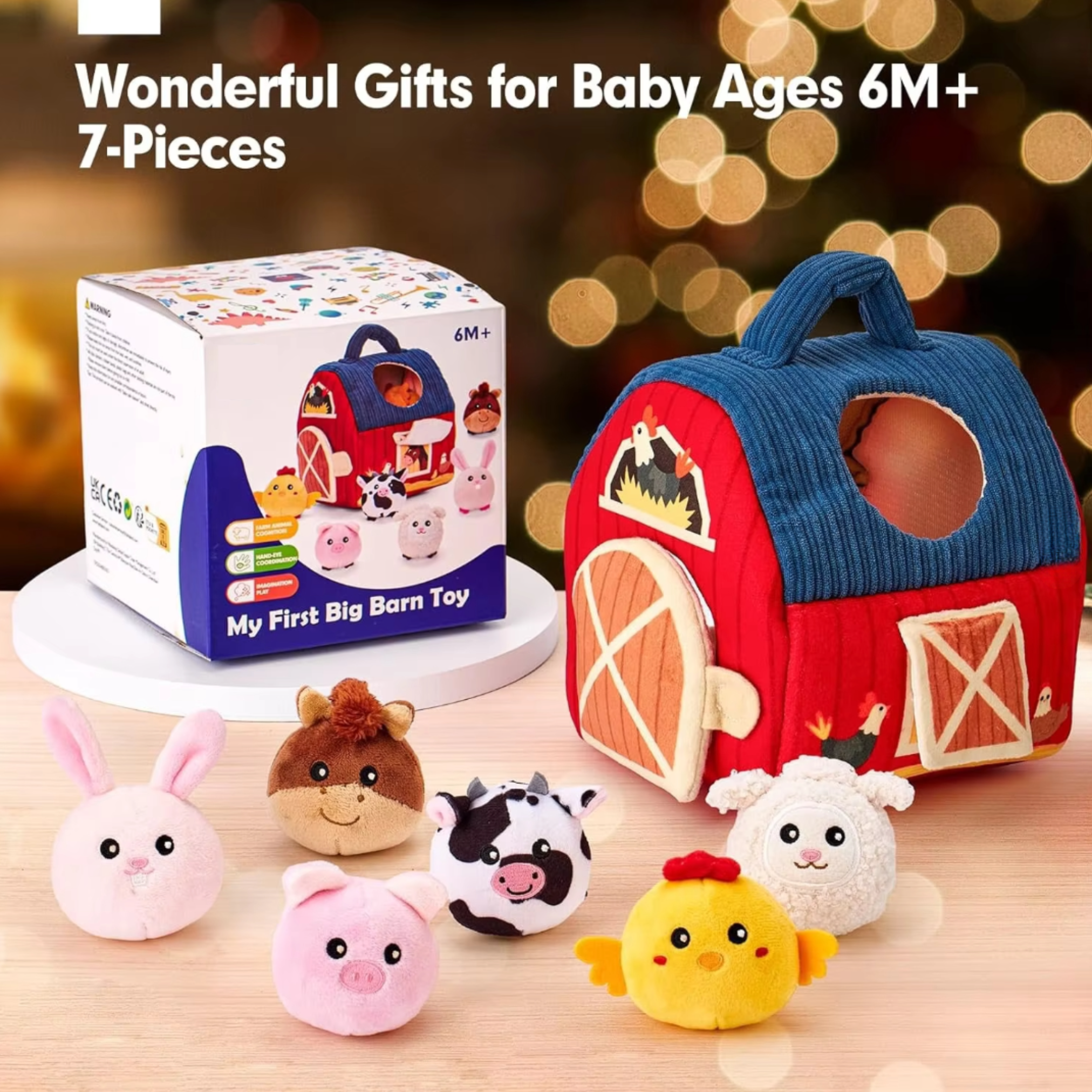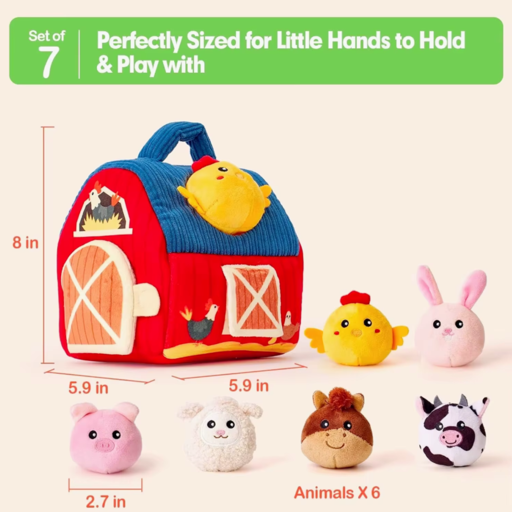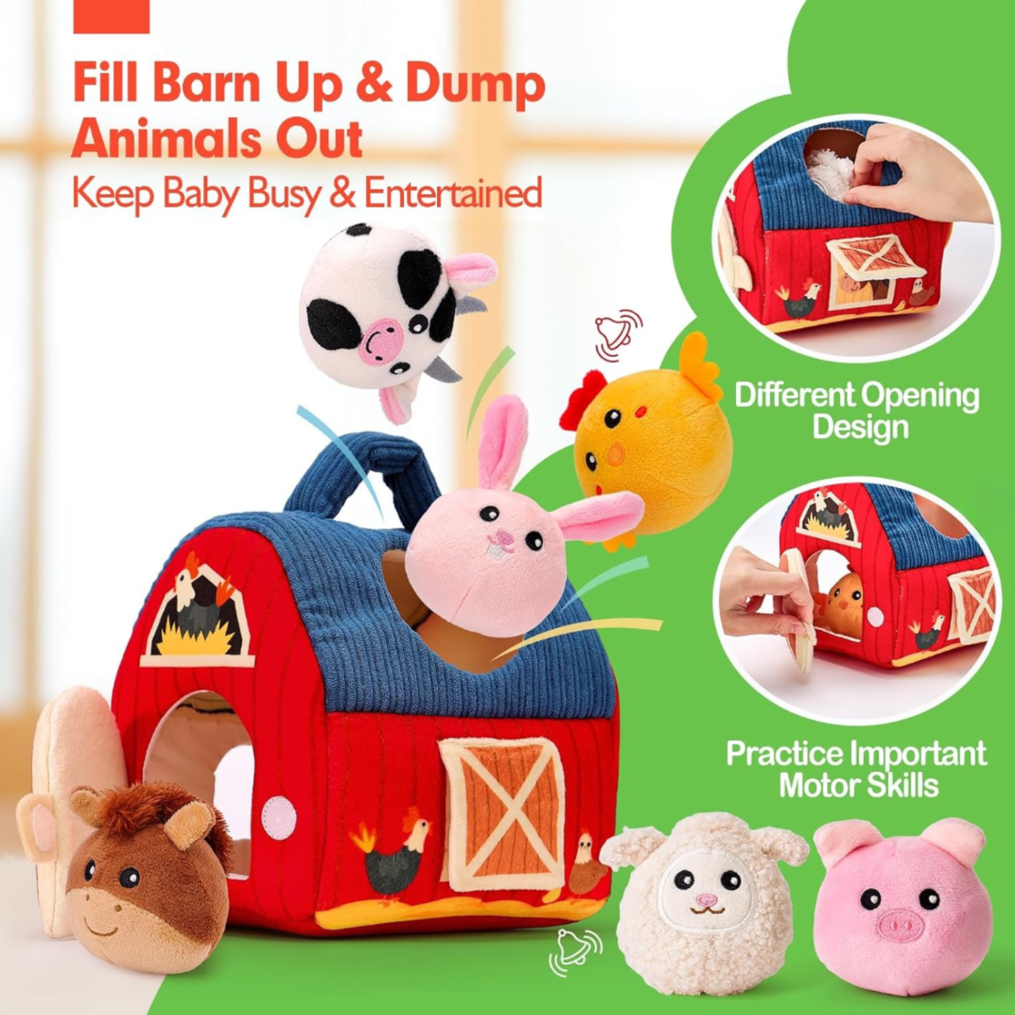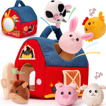 Giv din baby timevis af tryg og sjov leg med BabyBarn, et blødt og sikkert sanselegetøj designet til små hænder. Barnet kan fylde dyrene i laden, tage dem ud igen, åbne døren, kigge gennem hullerne og udforske de forskellige teksturer.